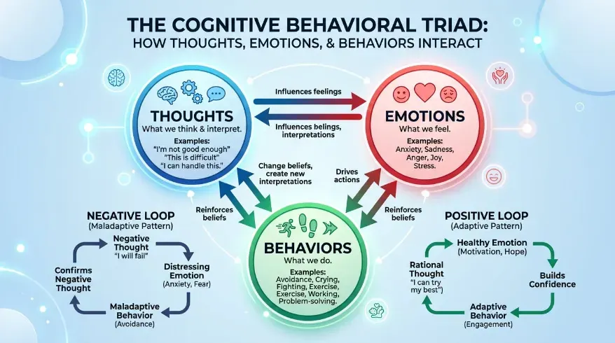 Learn how thoughts, emotions, and behavior interact to shape mental and emotional health, and why understanding this connection is key to resilience and wellbeing.