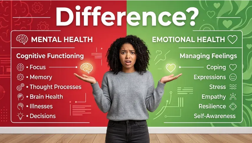 Learn the difference between mental health and emotional health, how they influence thinking and feelings, and why both are essential for psychological wellbeing.